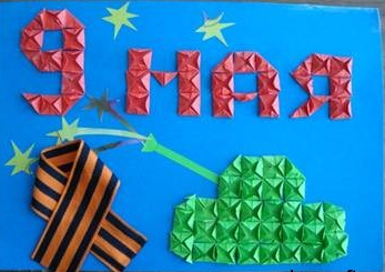 Лист серебристой или бронзовой бумаги согнуть пополам. Взять карандаш, и на одной из сторон нарисовать контуры для вырезания по ним части открытки. Это может быть звезда, цифра 9, вечный огонь, слово «мая» или что-то другое.