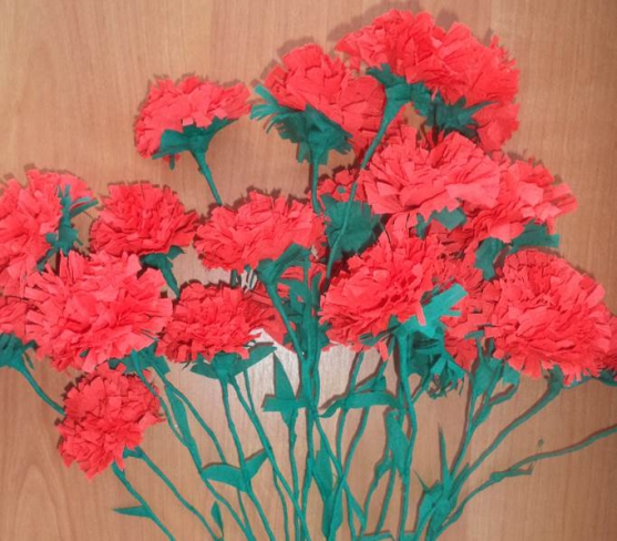 Доброе время суток, уважаемые маамцы, друзья и гости моей странички! Приближается праздник Великой Победы. По замечательной традиции нашего сада, мы с детками - выпускниками пойдем к памятнику Победы. Будет митинг, концерт и конечно, возложение цветов. Мы с ребятами приготовили вот такие гвоздички.
