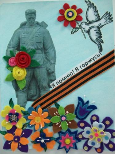 В преддверии Великого праздника Дня Победы, по всей стране началась подготовка к проведению праздника. У нас с в детском саду тоже готовимся к празднику: украшаем окна, участвуем в конкурсах рисунков, готовим поздравительные открытки. Сегодня я предлагаю Вам посмотреть нашу открытку "Я помню! Я горжусь! ", сделанную совместно с детьми. Детям был предложен необычный материал для работы-цветной фетр. По трафаретам девочки вырезали цветочки, наклеили готовые шаблоны друг на друга (по своему желанию, украсили серединку цветка разными пуговицами, бусинками, паедками. А затем на готовую картинку наклеили цветочки. Получилась очень красивая открытка.