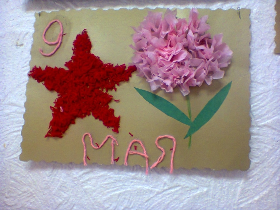 Сделали аппликацию, где из розовых и красных салфеток выложили гвоздику, а из красных ниток звезду. Красная звезда - это символ Победы в Великой Отечественной войне. Каждый ребенок вложил в работу частичку своей души, теплоты и любви.