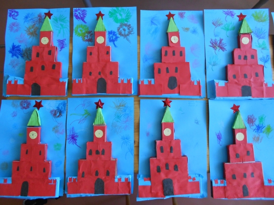С изнаночной стороны звезды по краям лучей нанести клеевые точки и приклеить её наверху Кремля, не нарушая общего объёма